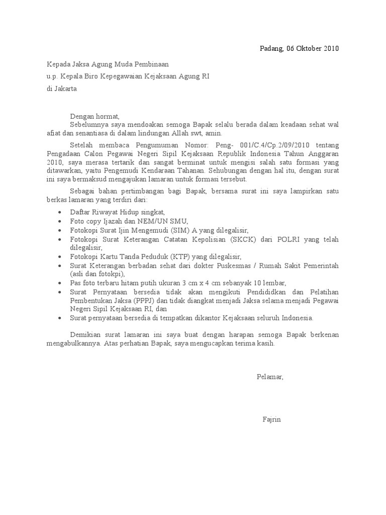 Contoh surat lamaran kerja yang baik dan benar untuk dijadikan referensi dalam usaha mencari kerja di sebuah perusahaan sesuai dengan keahlian kamu. Contoh surat lamaran pekerjaan berikut ini kami sajikan kepada para pelamar atau pencari kerja agar lebih mudah dan cepat mengajukan lamaran sesuai dengan posisi jabatan atau pekerjaan yang. Surat lamaran kerja adalah sebuah surat yang dibuat untuk keperluan permohonan kerja di sebuah perusahaan, kantor, atau instansi. Saat melamar pekerjaan dokument yang paling wajib di. Tempat dan tanggal pembuatan surat, nomor surat, lampiran, hal, dan banyak lagi lainnya yang dibahas di artikel ini.
